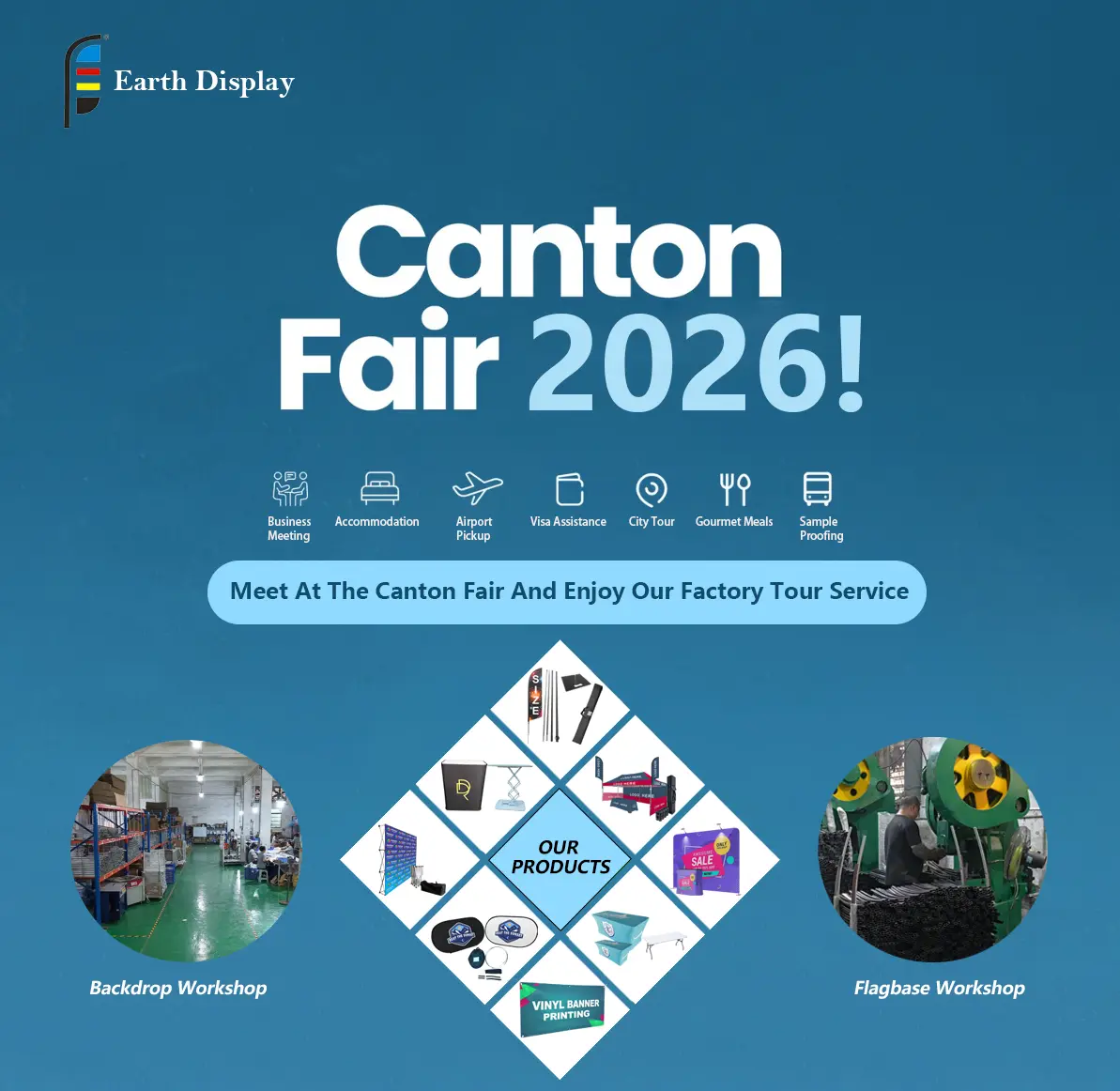 نمایشگاه کانتون 2026 در راه است، و ما در Earth Display واقعا امیدواریم شما را در آنجا ببینیم. بیش از ده سال است که پرچمهای پر، پسزمینههای پاپآپ، پایههای پرچم، بنرهای وینیل سفارشی – اساساً هر چیزی برای نمایشگاهها و تبلیغات – میسازیم. این بار، به جای اینکه صرفاً به صورت آنلاین صحبت کنیم، می خواهیم رو در رو به شما نشان دهیم که چه کاری انجام می دهیم.